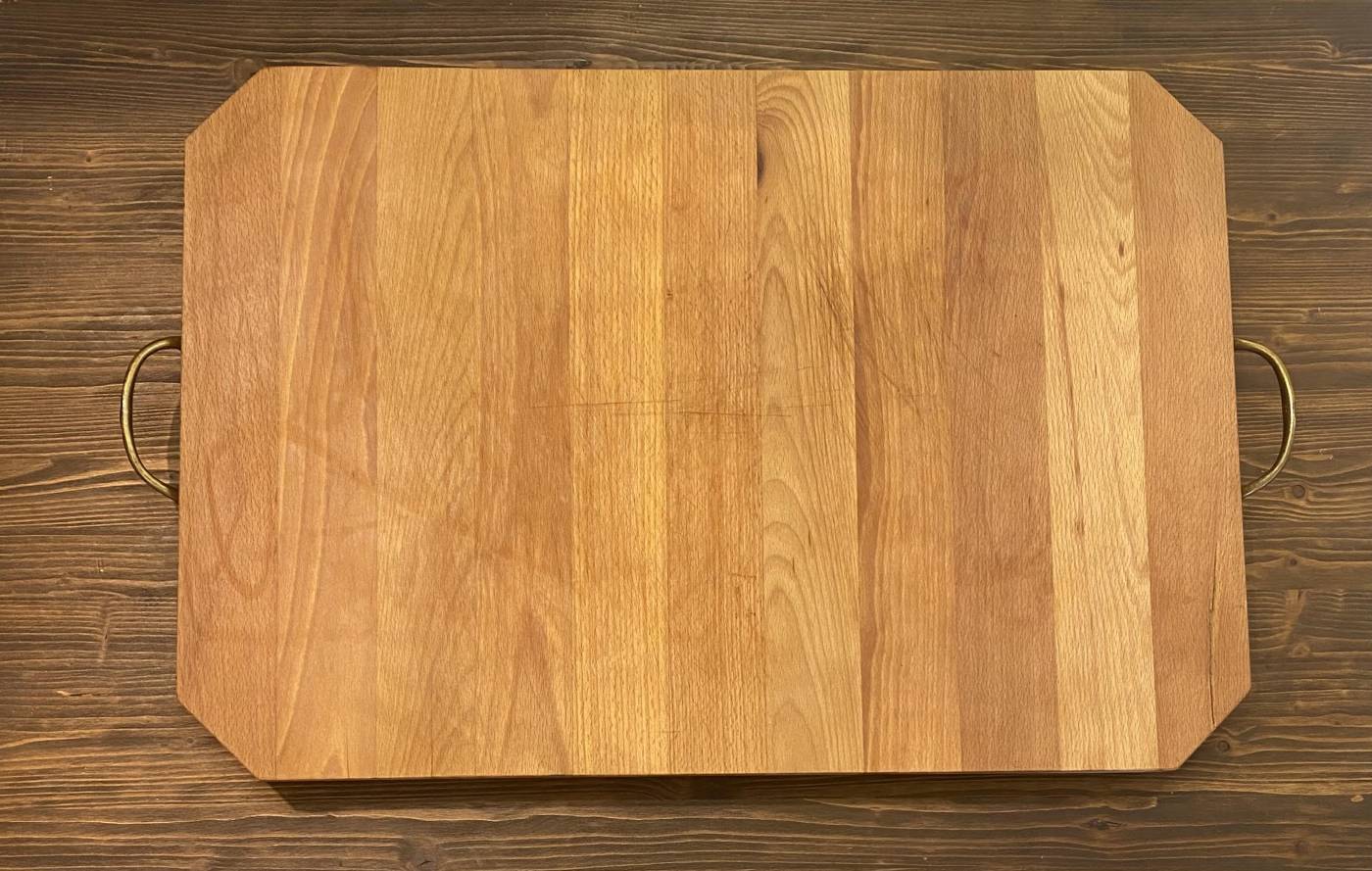 tagliere in legno massello con manici in ottone: 64,5cm x 44cm e altezza 4,5cm
