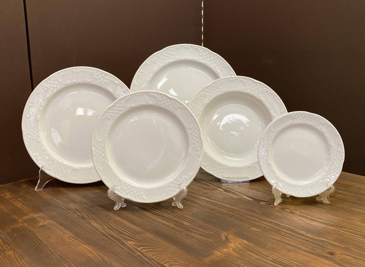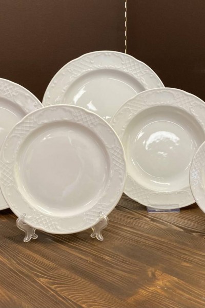 - sottopiatto Flora diametro 30cm - piatto piano Flora diametro 26cm - piatto fondo Flora diametro 23,5cm e profondità 3,5cm - piattino dessert Flora diametro 21cm - piattino pane Flora diametro 16cm