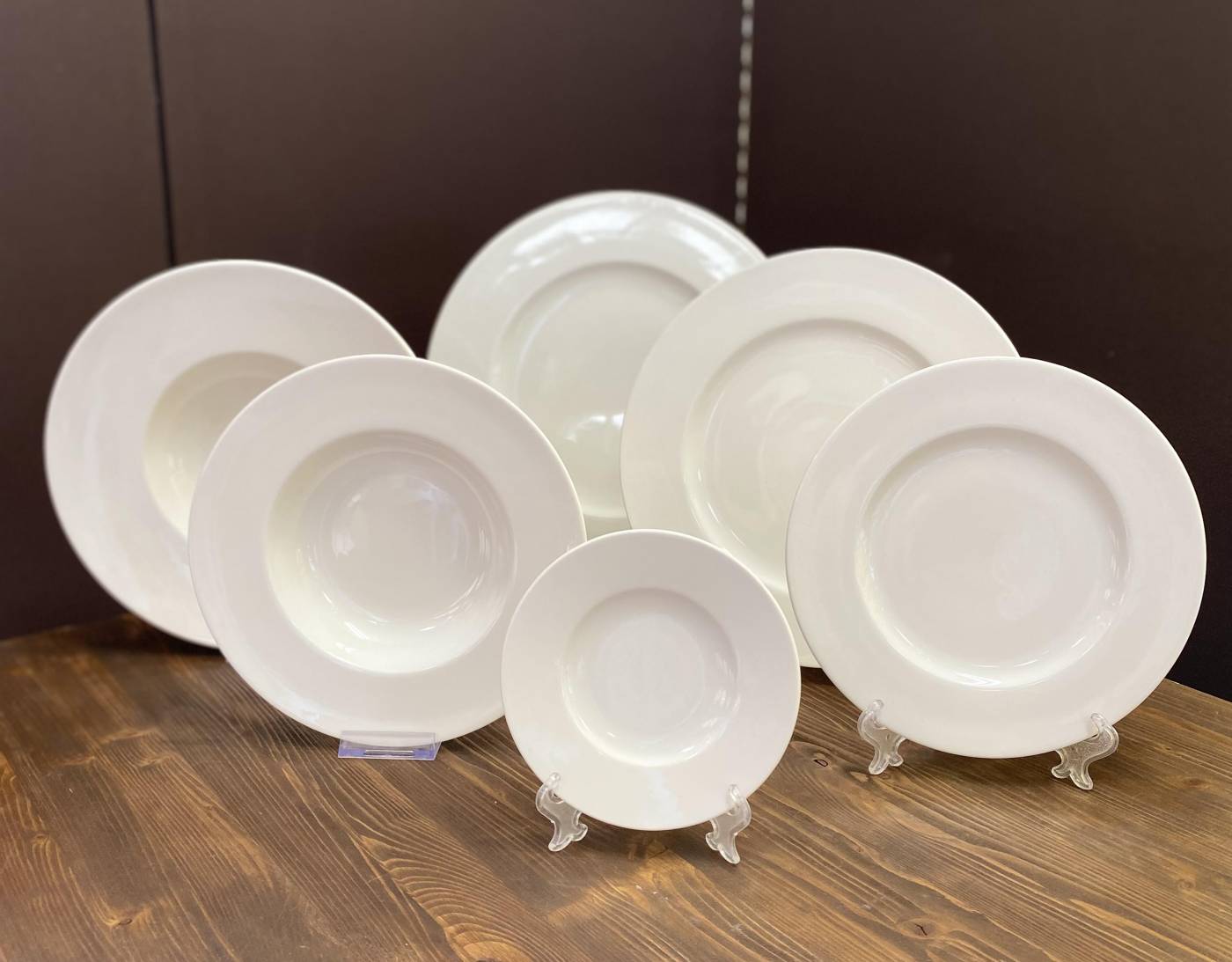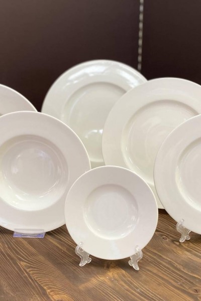 - sottopiatto avorio liscio diametro 32cm - piatto piano avorio liscio diametro 29,5cm - pasta bowl avorio liscio diametro 28cm e profondità 5,5cm - piatto fondo avorio liscio diametro 24,5cm e profondità 4,5cm - piattino dessert diametro 23,5cm - piattino pane diametro 16cm