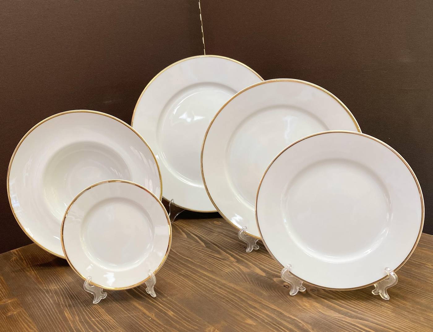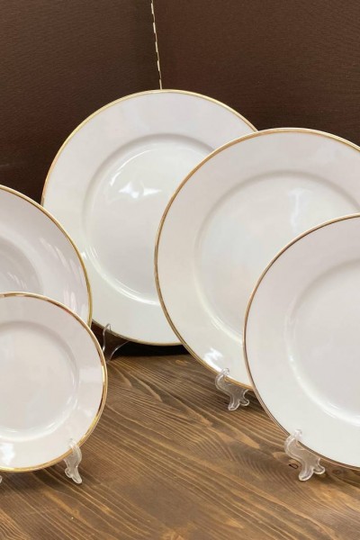 - sottopiatto filo oro diametro 32cm - piatto piano filo oro diametro 26,5cm - pasta bowl filo oro diametro 26,5cm e profondità 5,5cm - piattino dessert filo oro diametro 21cm - piattino pane filo oro diametro 16cm