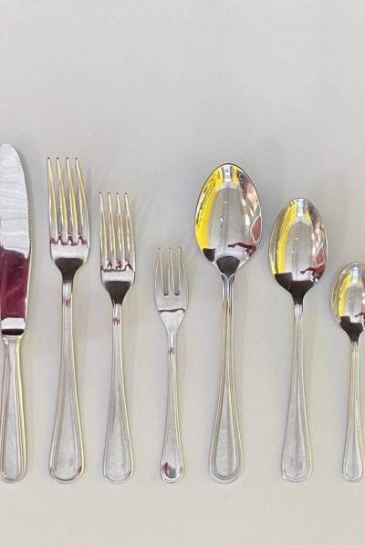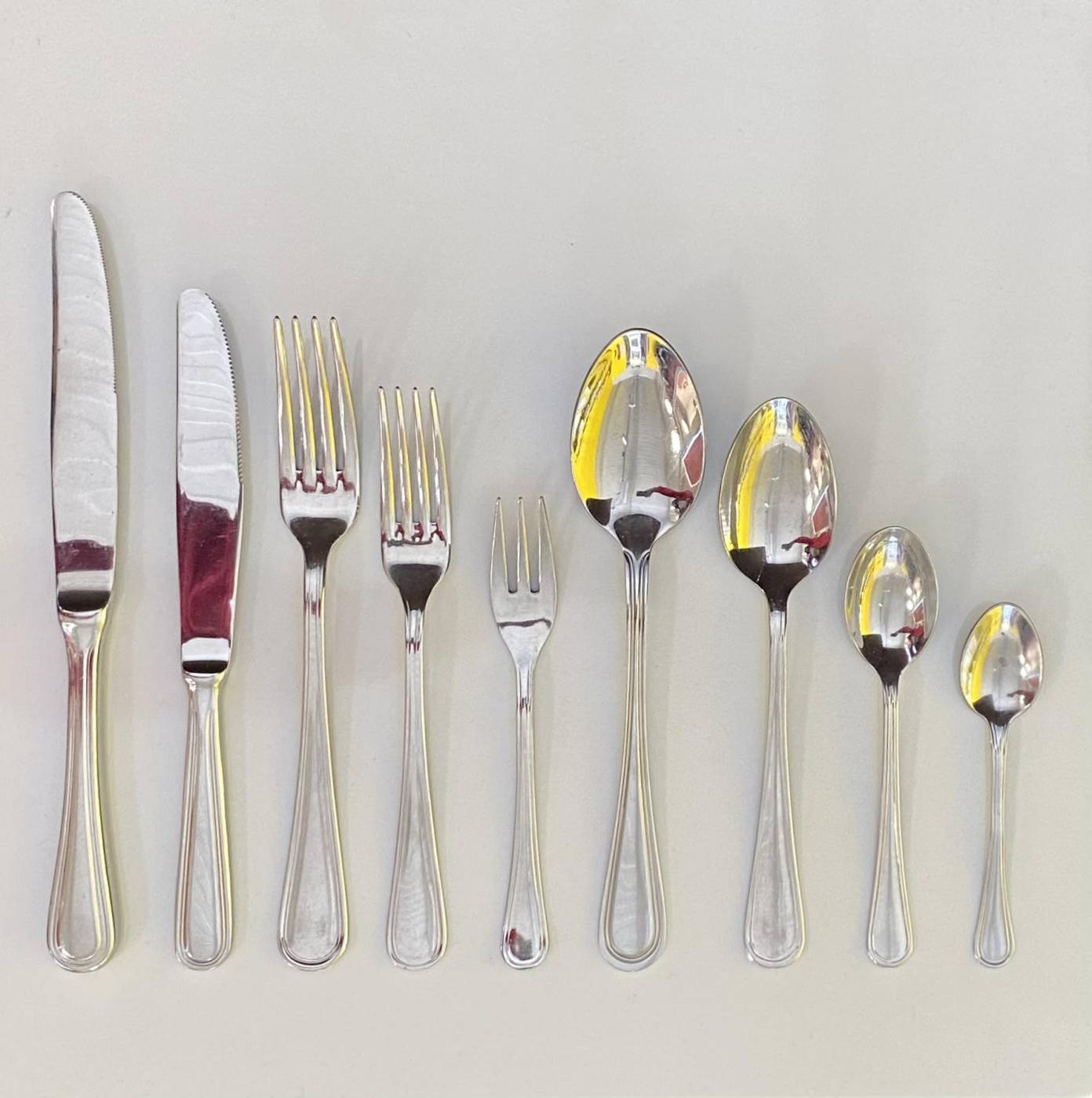 - coltello tavola - coltello dessert - forchetta tavola - forchetta dessert - forchettina tre punte - cucchiaio tavola - cucchiaio dessert - cucchiaio té - cucchiaio moka - forchetta e coltello pesce (vedi seconda foto)